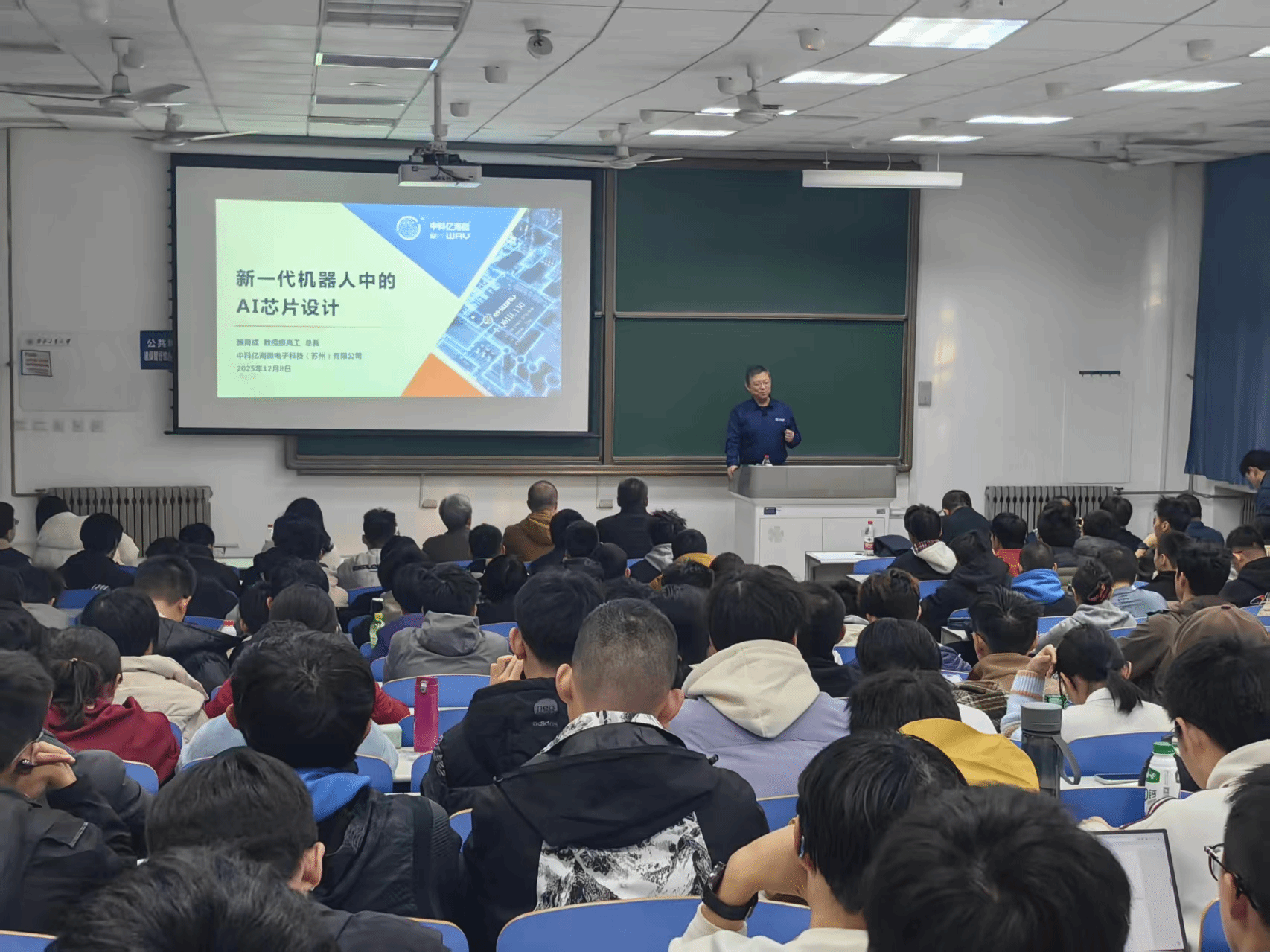在专题讲座中,魏育成以《新一代机器人中的AI芯片设计》为主题,从传统机器人到具身智能人形机器人的演进切入,系统阐述了AI芯片作为机器人“大脑”与“小脑”的核心作用。他结合FPGA+XPU多核异构架构、快慢双系统协同、3S工程(SoM-SiP-SoC)等关键技术路径,生动解读了AI芯片在感知、决策、控制环节的设计挑战与创新方案,并展示了中科亿海微在国产自主FPGA IP核、EDA工具链及机器人大小脑模组方面的布局与成果。报告内容既有前沿理论深度,又贴近产业实战,为在座师生呈现了一场融通学术、技术、产业三重视野的精彩分享。