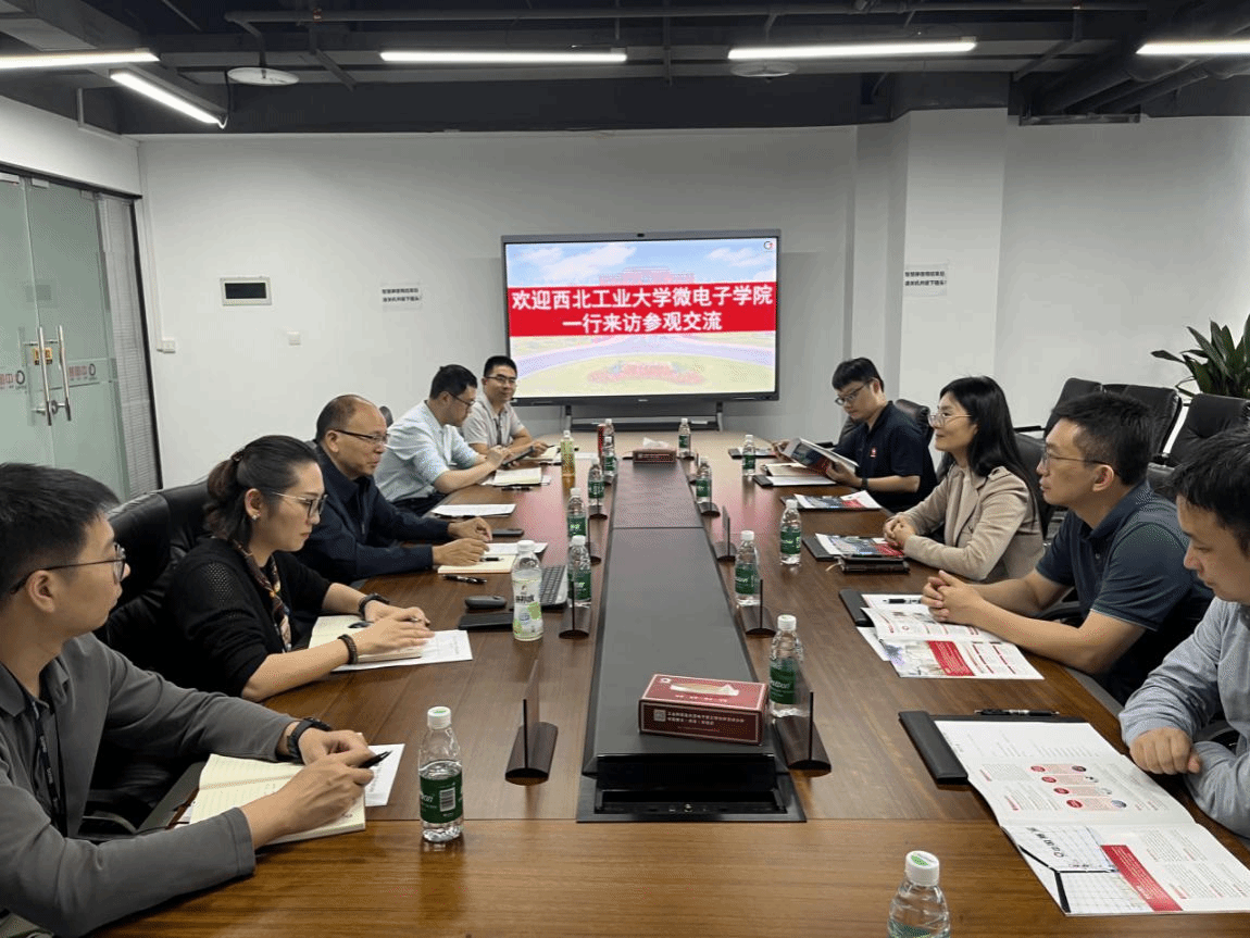 一行参观了电科芯片展厅,了解芯片领域的核心成果。电科芯片院科技市场部副主任彭松、集团首席专家付晓君陪同调研,彭松主持了座谈会。